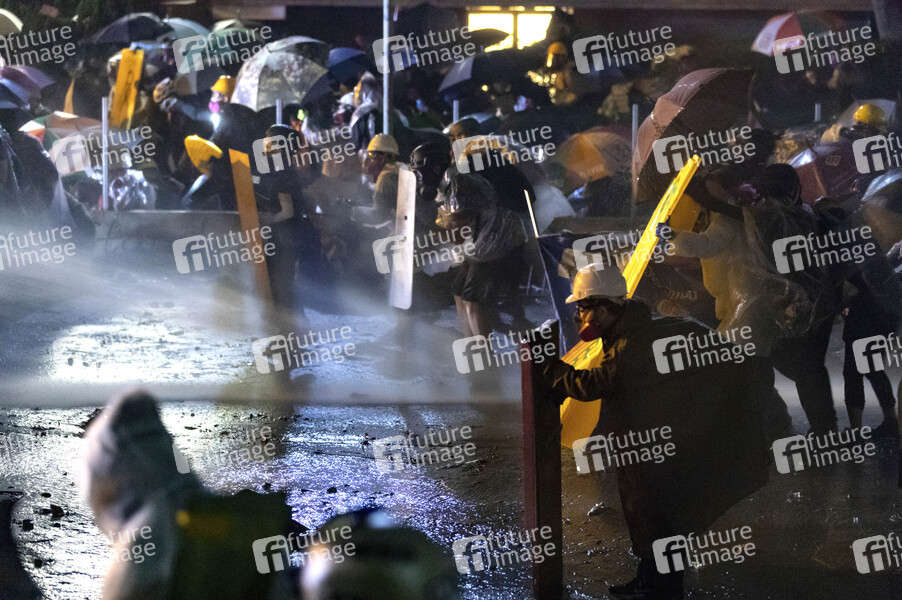 Studenten schützen sich vor Pfefferwasser - Belagerung an der Polytechnischen Universität. Die Polizei umstellt den Campus der Universität, nachdem Demonstranten den Cross-Harbor-Tunnel und die Hauptstraße außerhalb des Campus blockiert haben. Hongkong protestiert seit fünf Monaten ununterbrochen. Am Montag, dem 11. November 2019, begann ein Streik in der ganzen Stadt, der Teile von Hongkong zum Erliegen brachte, als MTR-Stationen geschlossen und mehrere Straßensperren errichtet wurden. Hongkong, 18.11.2019