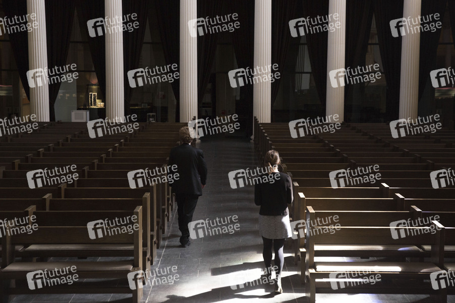 Die Pfarrerin Aline Seel und der Pfarrer Matthias Miele begehen den Karfreitag Gottesdienst in der menschenleeren St. Nikolaikirche. Um 15:00 Uhr ertönten die Glocken der Kirche. Potsdam, 10.04.2020