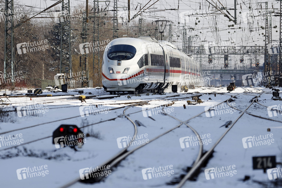 Ein ICE fährt bei Schnee in den HBF Hamm. Bei Schnee und Eis stehen bei der Deutschen Bahn Spezialtechnik und zehntausende Einsatzkräfte bundesweit bereit, um Bahnsteige und Gleise schnellstmöglich freizuräumen sowie Züge und Loks winterfest zu machen. (Themenbild, Symbolbild) Hamm, 16.02.2021
