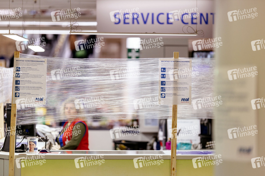 Schutzmaßnahmen gegen Corona in einem Real Supermarkt in Sülz. Köln, 27.03.2020