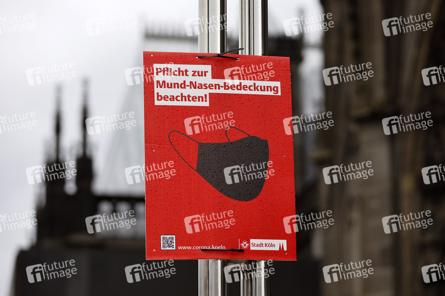 Mit der neuen Coronaschutzverordnung seit dem 1. Oktober 2021 ist in NRW die Maskenpflicht im Freien weggefallen. Angesichts der aktuellen Impfquote will Bundesgesundheitsminister Jens Spahn die 'epidemische Lage' (von nationaler Tragweite) ebenfalls nicht verlängern. Im Bild ein Hnweisschicht auf die Pflicht zum Tragen einer Mund-Nasen-Bedeckung, wie sie die Stadt Köln 2021 in der Innenstadt aufhing. Inzwischen sind die Schilder entfernt. (Archivbild, Themenbild, Symbolbild) Köln, 15.10.2021
