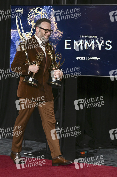 Seth Rogen mit den Emmys für die Comedy-Serie 'The Studio' beim Preisträger-Photocall der 77. Primetime Emmy Awards 2025 im Peacock Theater. Los Angeles, 14.09.2025