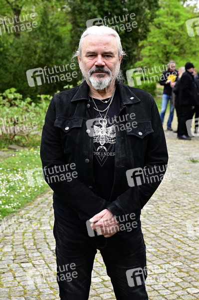 Hans-Jürgen Reznicek von Silly am Grab des verstorbenen Gitarristen von City, Fritz Puppel, auf dem Friedhof Baumschulenweg. Berlin, 10.04.2024