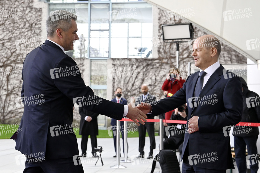 Karl Nehammer und Olaf Scholz beim Empfang des Bundeskanzlers der Republik Österreich mit militärischen Ehren im Bundeskanzleramt. Berlin, 31.03.2022
