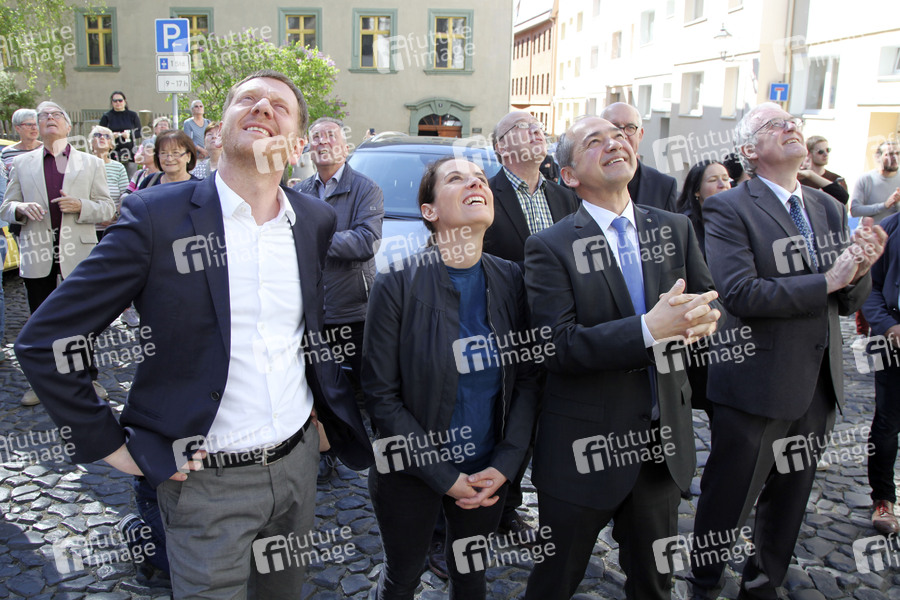 Michael Kretschmer, MadC und Rafal Gronicz bei der Enthüllung der Graffiti-Kunstwerke an den Türmen der Peterskirche. Görlitz, 25.04.2019