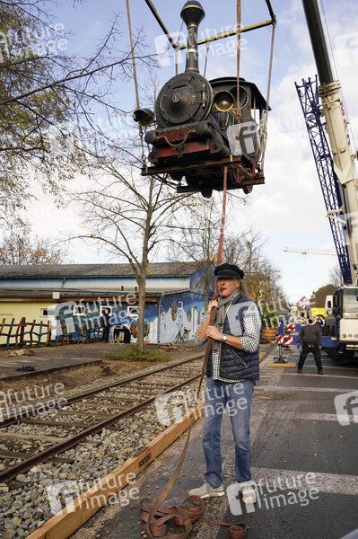 Ein weiteres Filmrequisit für die 'Giant Props' Sammlung ungewöhnlicher Originale, die Lokomotive Emma aus den Jim Knopf Filmen, wird auf der Straße der Giganten im Filmpark Babelsberg aufgestellt. Filmparkchef und 'Lokomotivführer' Friedhelm Schatz organisiert den Transport. Potsdam, 16.11.2020
