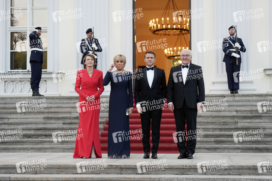 Elke Büdenbender, Brigitte Macron, Emmanuel Macron und Frank-Walter Steinmeier bei der Ankunft zum Staatsbankett zu Ehren des Staatspräsidenten der Französischen Republik im Schloss Bellevue. Berlin, 26.05.2024