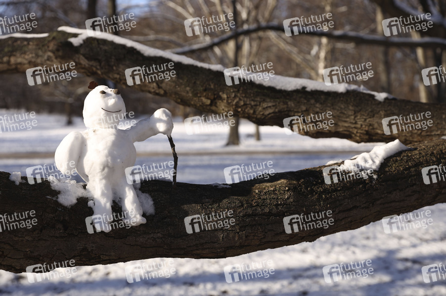Mini-Schneemann auf einem Ast sitzend, gesehen beim Winterspaziergang im Großen Tiergarten. Berlin, 31.01.2021