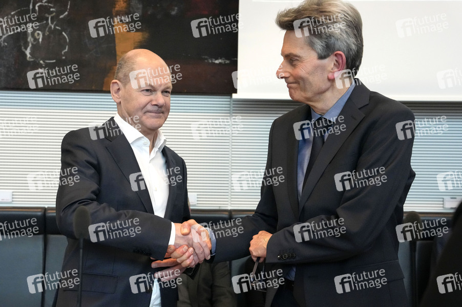 Olaf Scholz und Rolf Mützenich bei der Fraktionssitzung der SPD-Bundestagsfraktion im Reichstagsgebäude. Berlin, 12.03.2024