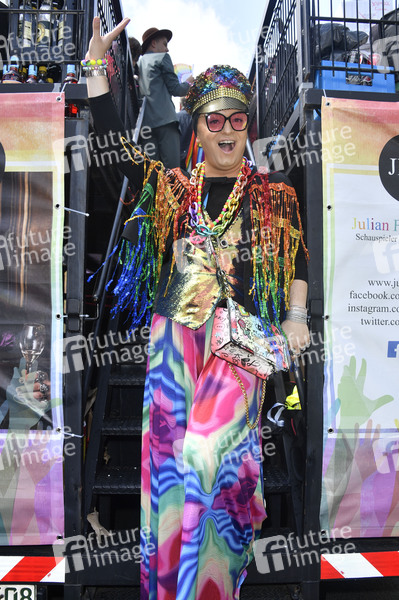 Julian F.M. Stoeckel auf dem JFMS Truck bei der 44. Christopher Street Day Parade 2022 unter dem Motto 'United in Love! Gegen Hass, Krieg und Diskriminierung' vom Spittelmarkt auf gut sieben Kilometern über Potsdamer Platz und Potsdamer Straße zum Nollendorfplatz, von dort weiter zur Siegessäule und zum Brandenburger Tor. Berlin, 23.07.2022