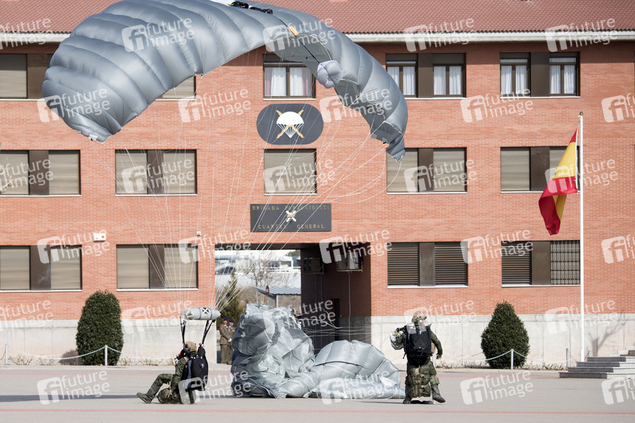 Fallschirmjäger bei der Flaggenzeremonie der Fallschirmjägerbrigade Almogávares auf der Princip Base. Paracuellos de Jarama, 23.02.2019