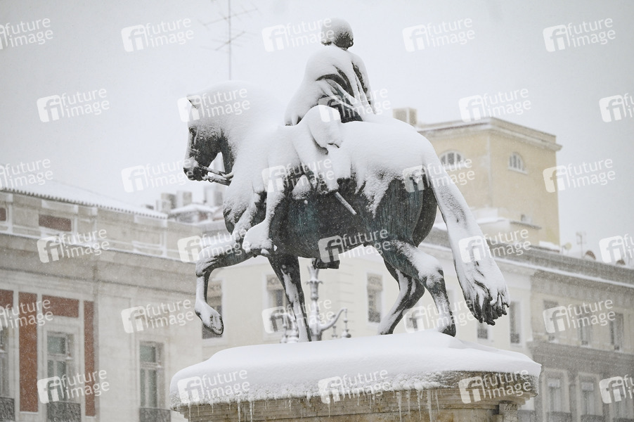 Der Puerta del Sol - Das Sturmtief Filomena sorgt in der Region Madrid und anderen Teilen Spaniens mit starken Schneefällen für Chaos. Die Hauptstadt Madrid wurde durch historisch heftigen Schneefall lahmgelegt. Seit 50 Jahren hat es nicht so geschneit. Der Verkehr ist in weiten Teilen des Landes zusammengebrochen. Madrid, 09.01.2021