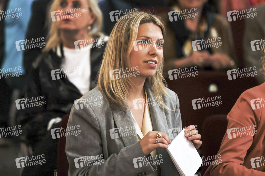 Luisa Nuhr bei der Präsentation der Wanderausstellung 'Woanders ist überall' mit Gemälden über die Geschichte und Kultur des Ruhrgebiets von Dieter Nuhr in der Kreuzkirche. Essen, 28.05.2024