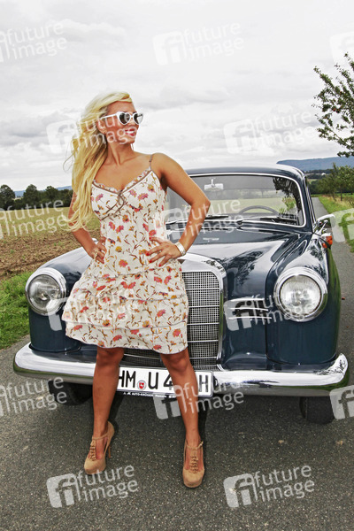 SOLsnap Cover-Model September 2011, Auto, Oldtimer, Mercedes-Benz Ponton 190 b Baujahr 1961, Erotik, sexy, Lolita, Sonnenbrille, Sommerkleid