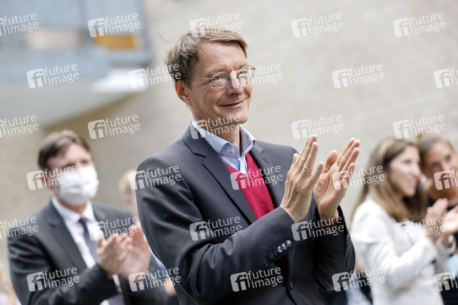 Karl Lauterbach applaudiert Özlem Türeci und Ugur Sahin, den Gründern des Biotechnologie-Unternehmens Biontech, bei ihrer Verleihung der bei der Verleihung der Ehrendoktorwürde der Medizinischen Fakultät der Uni Köln und der Eintragung ins Goldene Buch der Stadt Köln. Köln, 17.09.2021