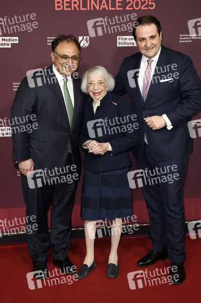 Walid Nakschbandi, Margot Friedländer und Nathanael Liminski beim 22. NRW Empfang des Landes NRW und der Film- und Medienstiftung NRW im Rahmen der Berlinale 2025 in der Vertretung des Landes Nordrhein-Westfalen. Berlin, 16.02.2025