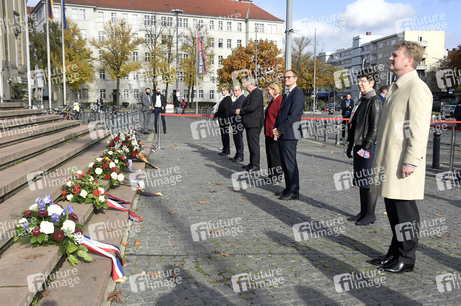 Jason Rhodes, Robin S. Quinville, Michael Müller, Angelika Schöttler, Stefan Böltes, Ralf Wieland und Sylvie Massiere beim Gedenkmoment zum 12 Uhr-Glockenschlag der Freiheitsglocke im Turm des Schöneberger Rathauses mit Gebindeniederlegung aus Anlass des 70-jährigen Jubiläums des ersten Glockenschlags vor dem Rathaus Schöneberg. Berlin, 24.10.2020