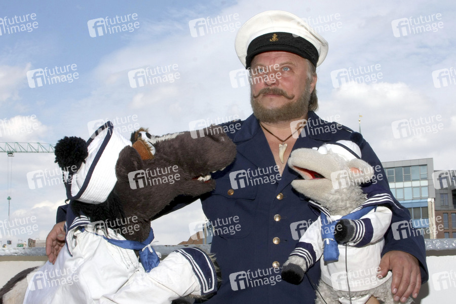 KI.KA Fototermin zum Sesamstraße Spin-Off 'Eine Möhre für Zwei' mit den Puppen Wolle und Pferd und Gaststar Axel Prahl auf dem Museumsschiff Cap San Diego in Hamburg