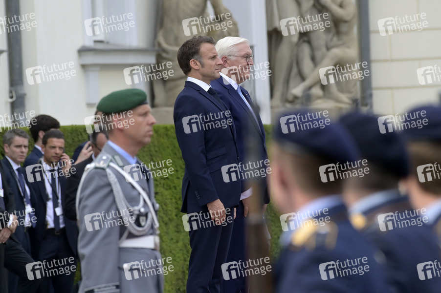 Emmanuel Macron und Frank-Walter Steinmeier beim Empfang des Staatspräsidenten der Französischen Republik mit militärischen Ehren im Schloss Bellevue. Berlin, 26.05.2024