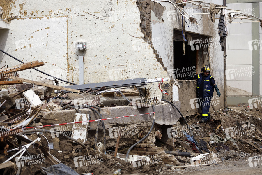 Nach dem Jahrhunderthochwasser in der Eifel durch heftige Regenfälle und Dauerregen mit Überschwemmungen und Überflutungen haben die Aufräumarbeiten im Ahrtal große Fortschritte gemacht. Einheiten von Polizei, THW, Bundeswehr und Feuerwehr mitsamt vielen freiwilligen Helfern haben Straßen geräumt, Schutt und Schlamm entfernt und die Menschen versorgt. Der Wiederaufbau wird trotzdem Jahre dauern. Im Bild Flutschäden in der Ortschaft Mayschoß, in der die Flut viele Häuser zerstörte, 08.08.2021