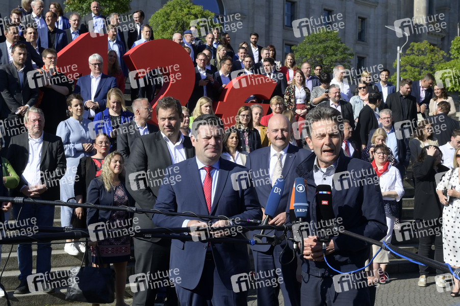 Lars Klingbeil, Hubertus Heil und Rolf Mützenich mit Gewerkschaftern und SPD-Mitgliedern bei einer Kundgebung zur Befürwortung des 12-Euro-Mindestlohns vor dem Reichstagsgebäude. Heute wird im Bundestag über den 12-Euro-Mindestlohn ab Oktober 2022 abgestimmt. Berlin, 03.06.2022