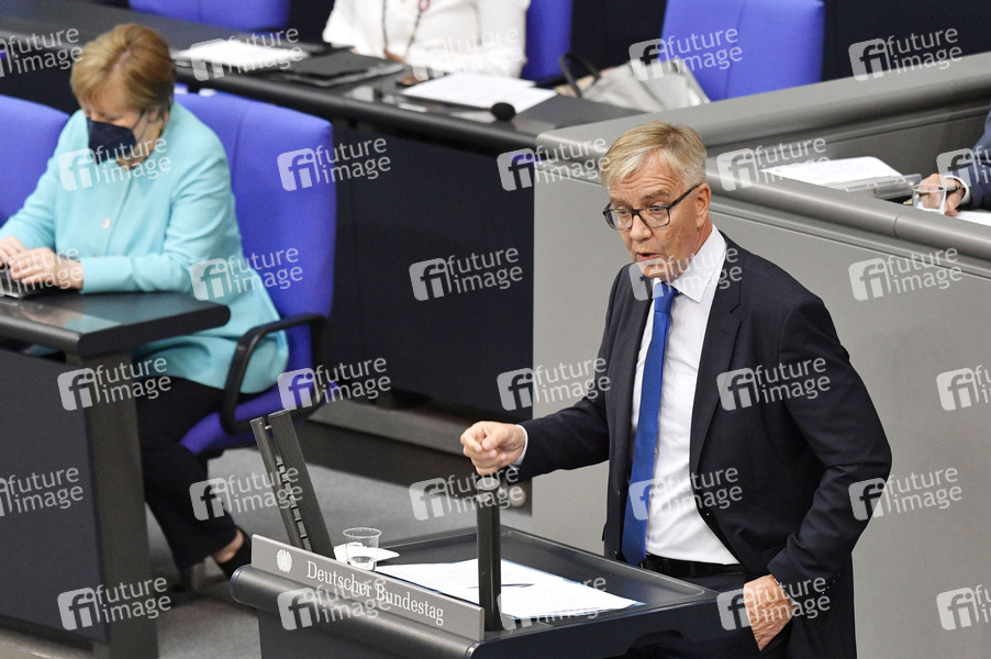 Angela Merkel und Dietmar Bartsch in der 236. Sitzung des Deutschen Bundestages im Reichstagsgebäude. Berlin, 24.06.2021