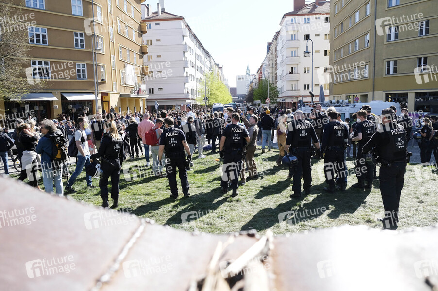 Protest der 'Kommunikationsstelle Demokratischer Widerstand Berlin' gegen die Einschränkung der Grundrechte durch Eindämmungsverordnung der COVID-19-Pandemie im Rahmen des Infektionsschutzes vor der Berliner Volksbühne. Die Demonstranten protestieren gegen die Einschränkung des Versammlungsrechts durch das Kontaktverbot und relativieren die Gefahr durch das Corona-Virus. Auch diese 4. Hygienedemo wurde von der Polizei aufgelöst. Die Polizei nahm mehrere Personen fest. An dem Protest beteiligten sich eine Reihe von Verschwörungstheoretikern. Berlin, 18.04.2020