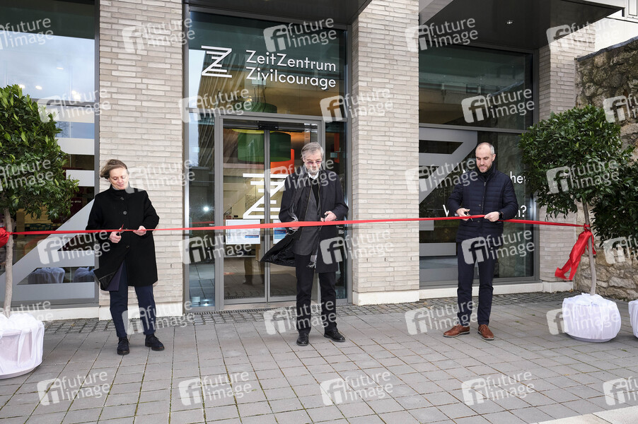 Konstanze Beckedorf (Kulturdezernentin Stadt Hannover), Dr. Karljosef Kreter (Leiter der städtischen Erinnerungskultur Hannover) und Belit Onay (Oberbürgermeister der Landeshauptstadt Hannover) bei der Eröffnung des ZeitZentrums Zivilcourage am Theodor-Lessing-Platz. Hannover, 12.03.2021