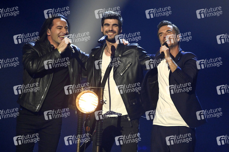 Bülent Ceylan, Martin Goldenbaum (Brenner) und Florian Silbereisen in der TV Show 'Schlagerbooom 2021 - Alles funkelt! Alles glitzert!' in der Dortmunder Westfalenhalle. Dortmund, 23.10.2021
