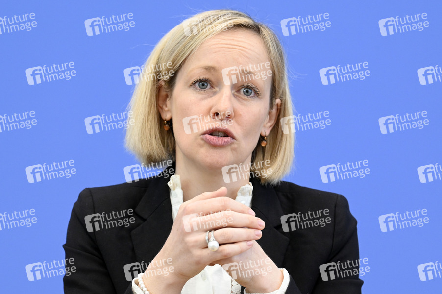 Louisa Specht-Riemenschneider bei der Bundespressekonferenz Digitale Gesundheitsdaten, Künstliche Intelligenz und Sicherheit - innovativ und datenschutzfreundlich. Vorstellung des 33. Tätigkeitsberichts für den Datenschutz und die Informationsfreiheit im Haus der Bundespressekonferenz. Berlin, 10.04.2025