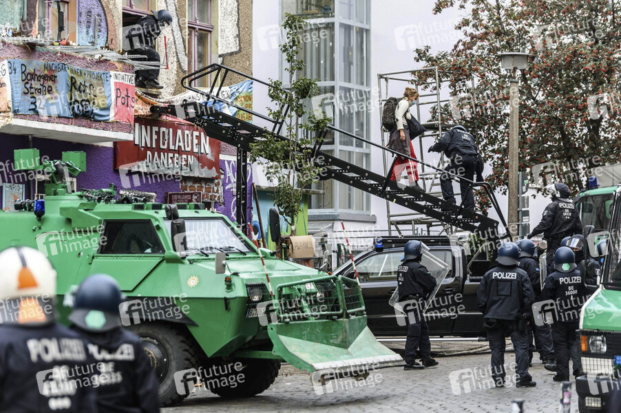 Die Berliner Polizei hat das Wohnprojekt Liebig34 in Berlin-Friedrichshain geräumt. Polizisten verschafften sich Zugang zu dem Haus führten nach und nach die Bewohnerinnen heraus. Die Berliner Polizei war mit 1500 Beamten im Einsatz. Vor dem Haus kam es zu Demonstrationen. Berlin, 09.10.2020