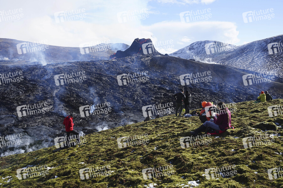 Spalteneruption am Berg Fagradalsfjall auf der Halbinsel Reykjanes im Südwesten Islands. Die Lava fließt in das Tal Geldingadalur. Besucher können das Gebiet bereten. Die Sicherheit wird durch Rettungsteams, Wissenschaftler und Polizei gewährleistet, die das Gebiet bei Gefahr sperren. Grindavik, 23.03.2021