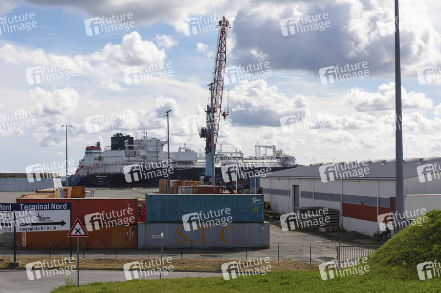 Im Industriehafen Mukran auf Rügen ist seit dem 02. September 2024 das Energie-Terminal Mukran im Regelbetrieb. Im Regelbetrieb soll ein LNG-Tanker etwa alle 3 bis 4 Tage das Terminal anlaufen und seine Ladung löschen. Das LNG wird in Mukran regasifiziert, über eine Pipeline nach Lubmin transportiert und dort in das deutsche Ferngasleitungsnetz eingespeist. Mukran, 18.09.2024