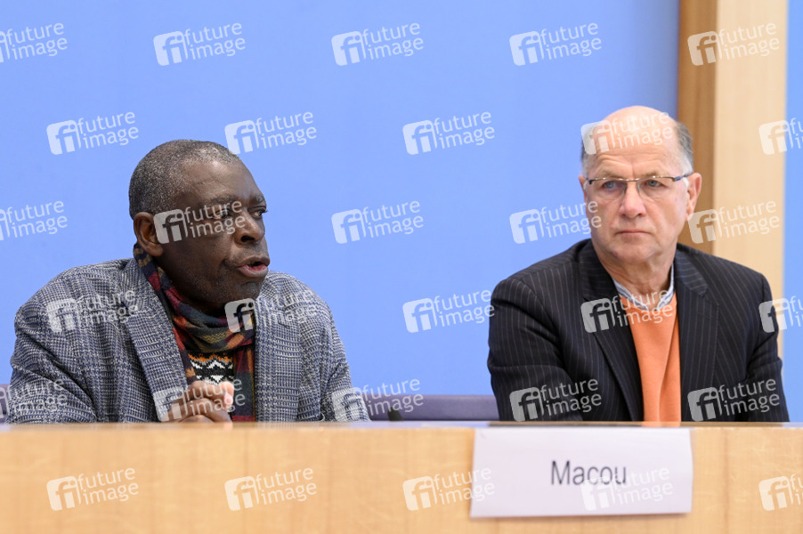 David Macou und Hans-Joachim Döring bei der Bundespressekonferenz zum Schicksal der ehemaligen DDR-Vertragsarbeiter aus Mosambik und ihre Entschädigungsforderungen im Haus der Bundespressekonferenz. Berlin, 30.09.2024