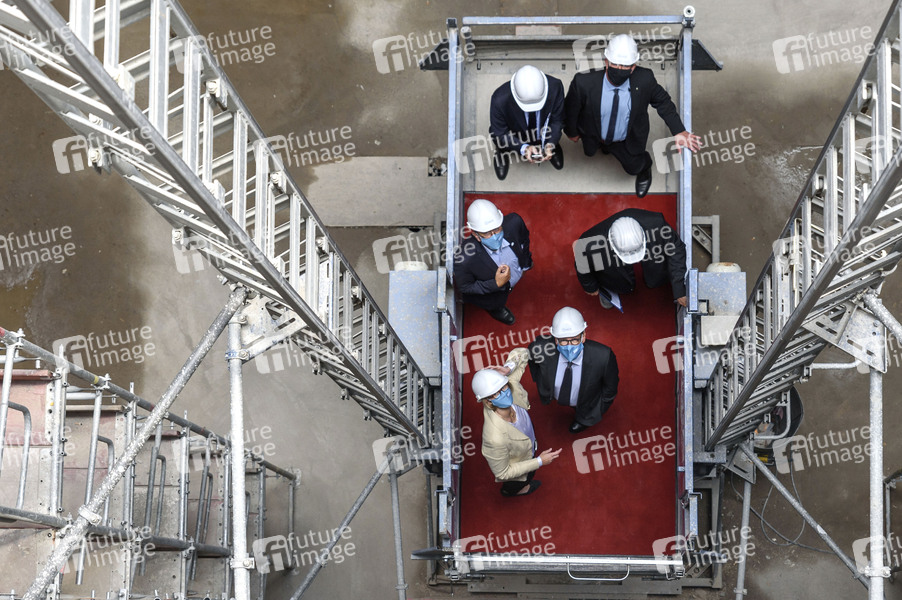 Regierender Bürgermeister Michael Müller, Wissenschaftssenatorin Anja Karliczek und Prof. Heyo K. Kroemer (Vorstandsvorsitzender der Charité) beim Richtfest für das kombinierte Ambulanz-, Translations- und Innovationszentrum (ATIZ) der Charité und des Berliner Instituts für Gesundheitsforschung (Berlin Institute of Health, BIH). Berlin, 20.07.2020