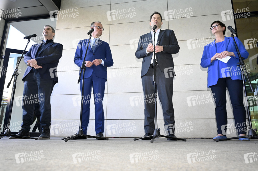 Markus Söder, Friedrich Merz, Lars Klingbeil und Saskia Esken beim gemeinsamen Auftaktstatement der Parteivorsitzenden von CDU, CSU und SPD zur Bildung einer neuen Regierungskoalition im Willy-Brandt-Haus. Berlin, 28.03.2025