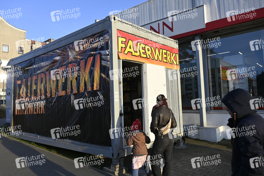 Verkauf von Feuerwerk auf dem Wochenmarkt im Deutsch-Polnischen Grenzgebiet Görlitz-Zgorzelec am 30.12.2024. In Deutschland ist Feuerwerk der Kategorie 3 verboten. Wenige Tage vor dem Jahreswechsel warnen Feuerwehr und Polizei vor dem Abbrennen illegaler Pyrotechnik. Durch den unsachgemäßen Umgang mit in Deutschland nicht zugelassenem Feuerwerk können schweren Verletzungen entstehen. Denn in der Nacht zum Jahreswechsel wird immer wieder auf sogenannte Polen-Böller zurückgegriffen, die in Deutschland keine Zulassung haben. Die Zulassung von Feuerwerk unterliegt in Deutschland strengen Vorgaben, die im Sprengstoffgesetz geregelt sind. Danach dürfen nur Silvesterknaller mit einer Nettosprengmasse von maximal 6 Gramm verkauft werden. (Symbolfoto, Themenfoto) Zgorzelec, 30.12.2024