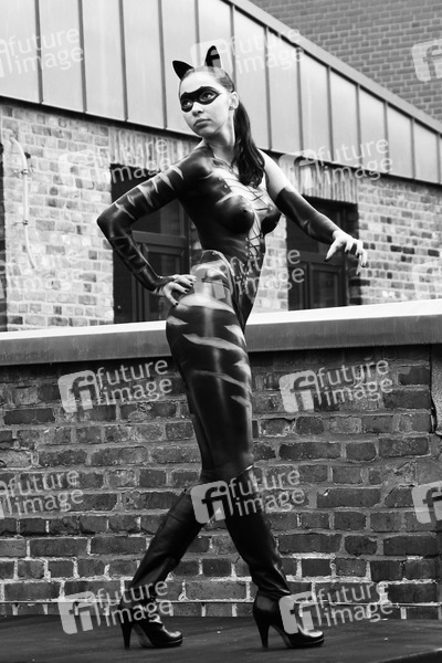 Catwoman Photoshooting mit SOLsnap-Model Elena im Hefehof-Center, Hameln. Bodypaint-Künstler: Jörg Düsterwald