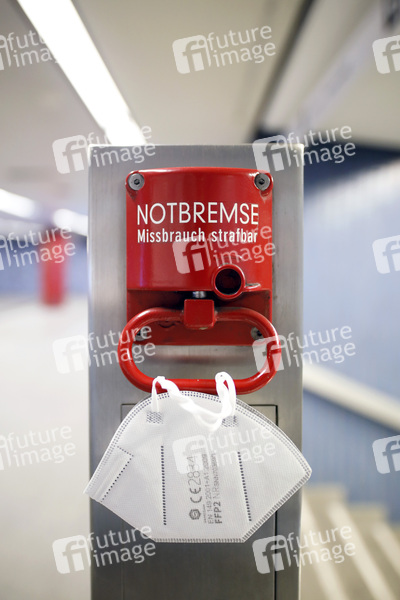 An einer Notbremse in einer Bahnhaltestelle hängt eine FFP2-Maske. Der Bundestag soll am kommenden Mittwoch über die sogenannte Bundes-Notbremse entscheiden. Die von der Bundesregierung geplanten Änderungen am Infektionsschutzgesetz sehen unter anderem eine nächtliche Ausgangssperre vor. (Themenbild, Symbolbild) Köln, 14.04.2021