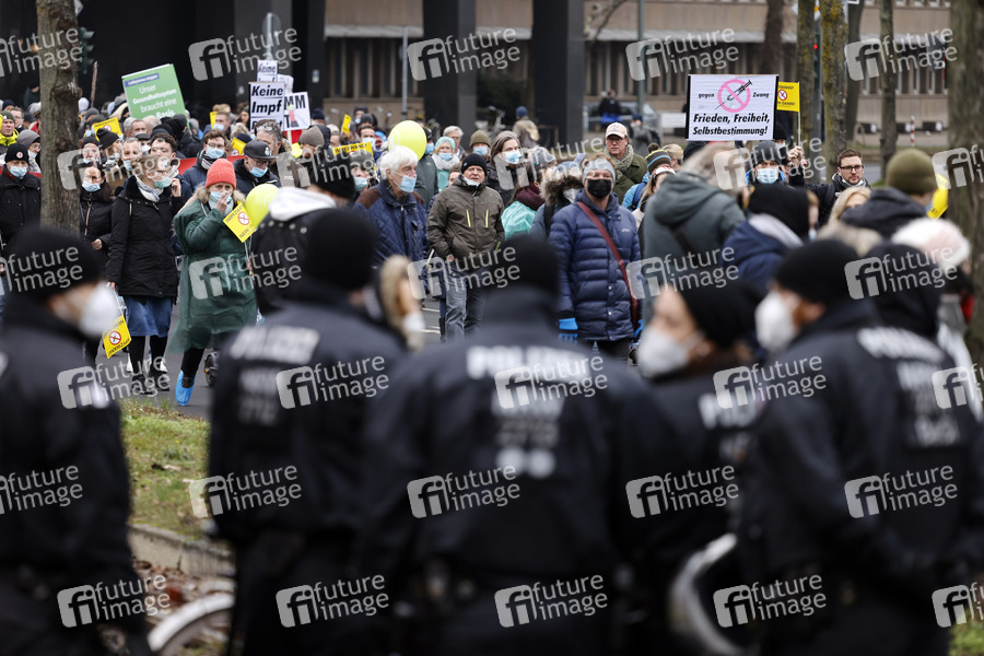 Bei einer angemeldeten Demo demonstrierten etwa 8000 Gegner einer Impfpflicht mit einem Spaziergang gegen die Corona-Maßnahmen der Bundesregierung - darunter auch viele Pflegekräfte, die wegen der Impfpflicht im Gesundheitsbereich ihren Job zu verlieren drohen. Düsseldorf, 15.01.2022