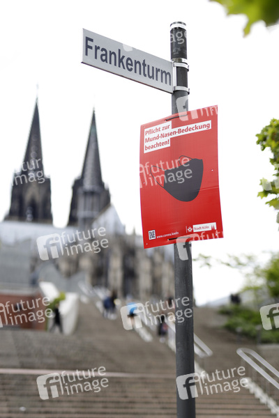 Die Maskenpflicht im Freien soll fallen. Diese und einige weitere Lockerungen der Corona-Schutzmaßnahmen kündigte das Land NRW an. Im Bild ein Hnweisschicht auf die Pflicht zum Tragen einer Mund-Nasen-Bedeckung, wie sie die Stadt Köln 2021 in der Innenstadt aufhing. Inzwischen sind die Schilder entfernt. (Archivbild, Themenbild, Symbolbild) Köln, 28.09.2021