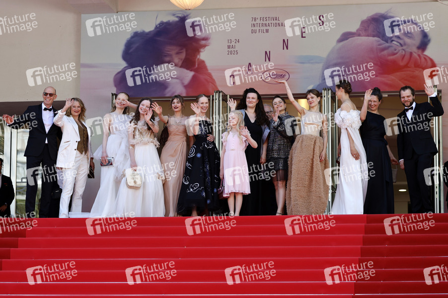 Lucas Schmidt, Maren Schmitt, Luzia Oppermann, Laeni Geiseler, Gast, Susanne Wuest, Hanna Heckt, Mascha Schilinski, Lena Urzendowsky, Lea Drinda, Luise Heyer, Louise Peters und Fabian Gamper bei der Premiere des Kinofilms 'Sound of Falling' auf dem Festival de Cannes 2025 / 78. Internationale Filmfestspiele von Cannes im Palais des Festivals. Cannes, 14.05.2025