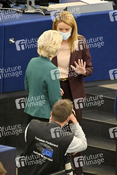 Ursula von der Leyen und Roberta Metsola bei einer Fragestunde zu zwei Jahren Kommission von der Leyen und die Umsetzung der politischen Prioritäten im Plenarsaal des Europäischen Parlaments. Straßburg, 05.04.2022