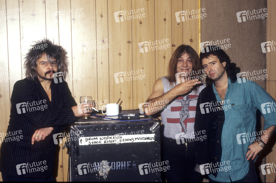 Phil 'Philthy Animal' Taylor, Michael 'Würzel' Burston und Phil 'Wizzö' Campbell von Motörhead bei einem Photoshooting im Tonstudio. London, 12.12.1991