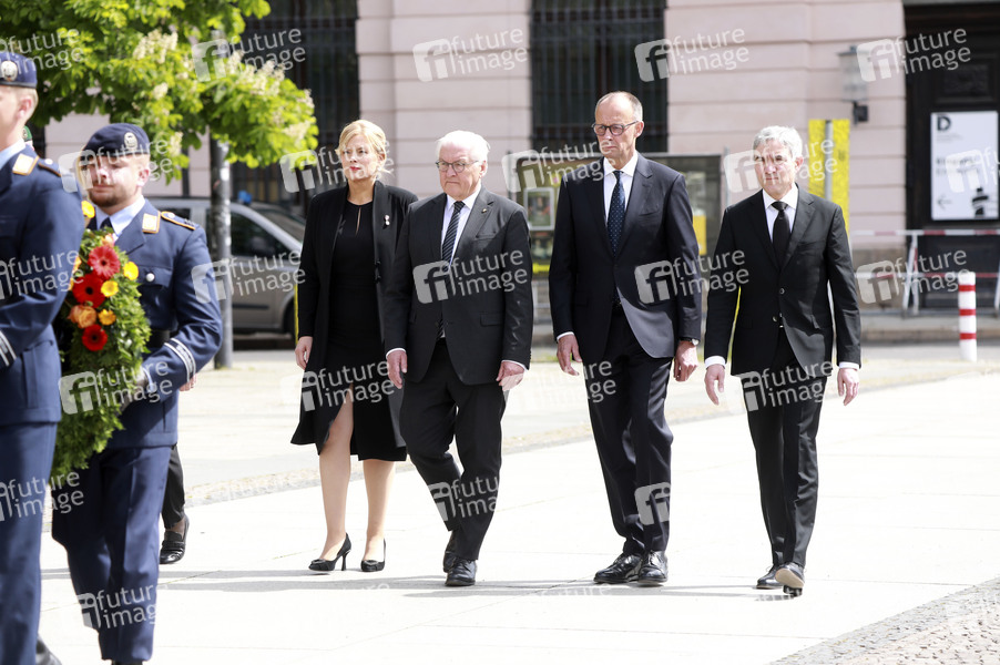 Julia Klöckner, Frank-Walter Steinmeier, Friedrich Merz und Stephan Harbarth bei der Kranzniederlegung mit den Repräsentantinnen und Repräsentanten der Verfassungsorgane des Bundes zum 80. Jahrestag des Endes des Zweiten Weltkrieges in Europa in der Neuen Wache. Berlin, 08.05.2025
