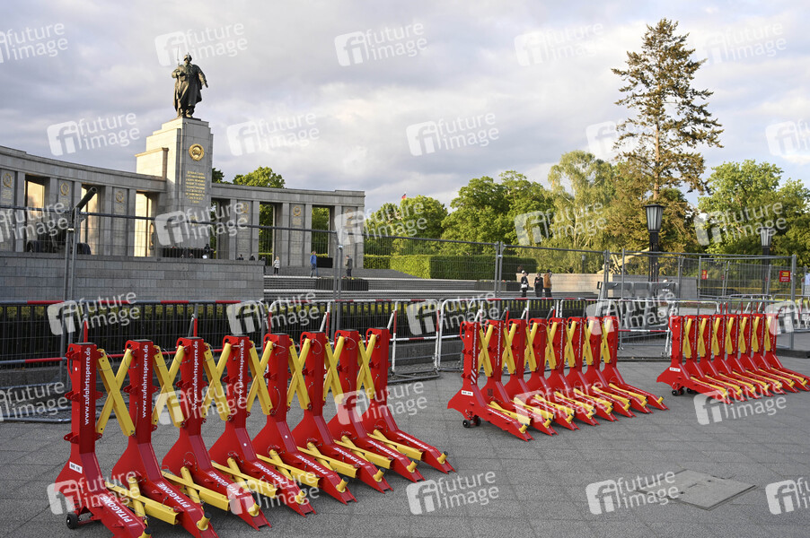 Zufahrssperren am Sowjetisches Ehrenmal Tiergarten. Mobile Sicherheitsperren werden von Institutionen wie Städten, Kommunen, Polizei, Militär und Regierungsbehörden gegen Fahrzeugattacken eingesetzt. (Symbolfoto, Themenfoto) Berlin, 08.05.2025