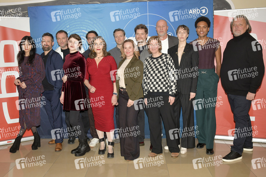 Pegah Ferydoni, Mark Monheim, Mark Waschke, Johanna Polley, Thomas Andre Szabo, Julia Kratz, Robin Sondermann, Tara Linke, Philipp Lind, Verena Veihl, Robin Sondermann, Simon Werner, Jules Elting, Lamin Leroy Gibba und Jens C. Susa bei der Premiere des ARD Fernsehfilms 'Tatort - Vier Leben' im Delphi-Filmpalast am Zoo. Berlin, 20.01.2025