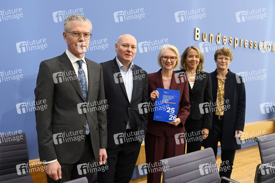 Martin Werding, Achim Truger, Monika Schnitzer, Ulrike Malmendier und Veronika Grimm bei der Bundespressekonferenz 'Vorstellung des Jahresgutachtens 2025/26 - Sachverständigenrat zur Begutachtung der gesamtwirtschaftlichen Entwicklung' im Haus der Bundespressekonferenz. Berlin, 12.11.2025