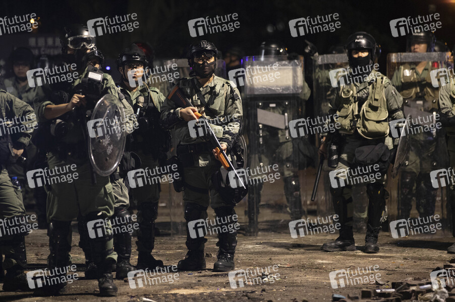 Polizei am Eingang der Universität - Kampf an der Chinese University Hong Kong (CUHK). Hongkong protestiert seit fünf Monaten ununterbrochen. Am Montag, dem 11. November 2019, begann ein Streik in der ganzen Stadt, der Teile von Hongkong zum Erliegen brachte, als MTR-Stationen geschlossen und mehrere Straßensperren errichtet wurden. Hongkong, 12.11.2019