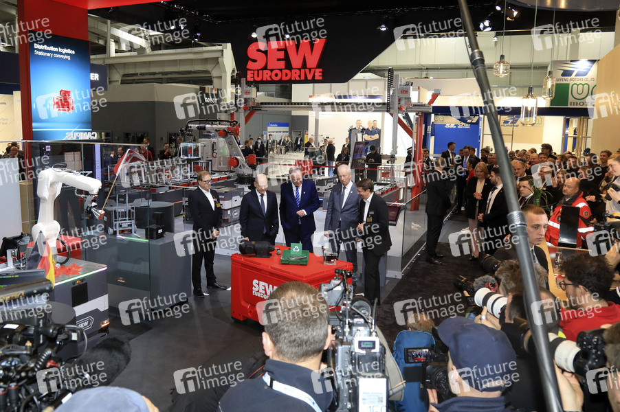 Olaf Scholz, Stephan Weil und Stephane Dion am Stand der Firma SEW Eurodrive beim Eröffnungsrundgang auf der Hannover Messe 2025 auf dem Messegelände. Hannover, 31.03.2025